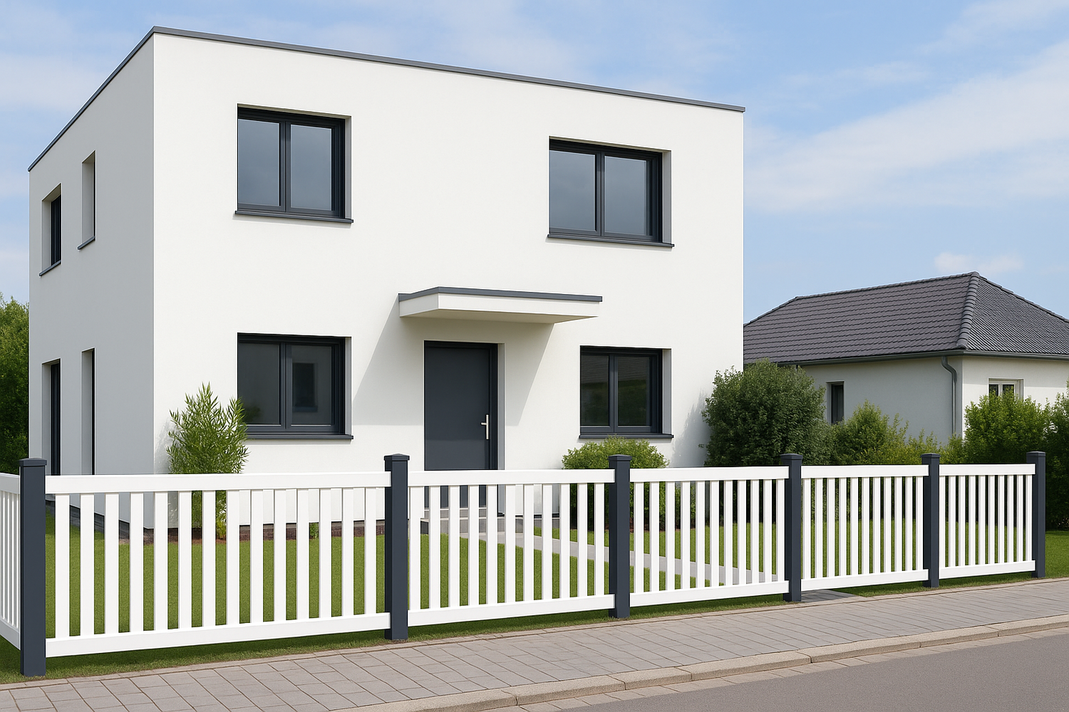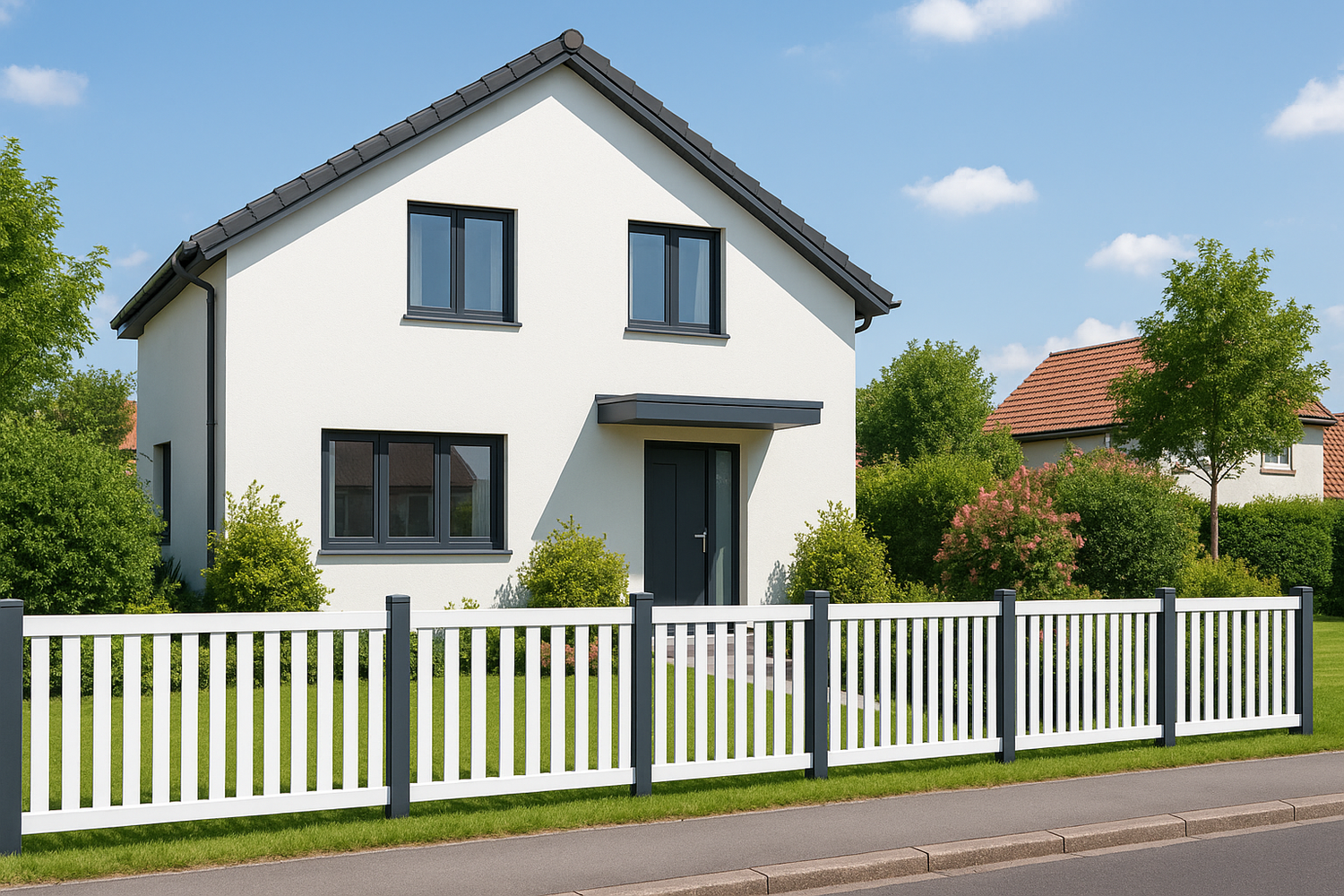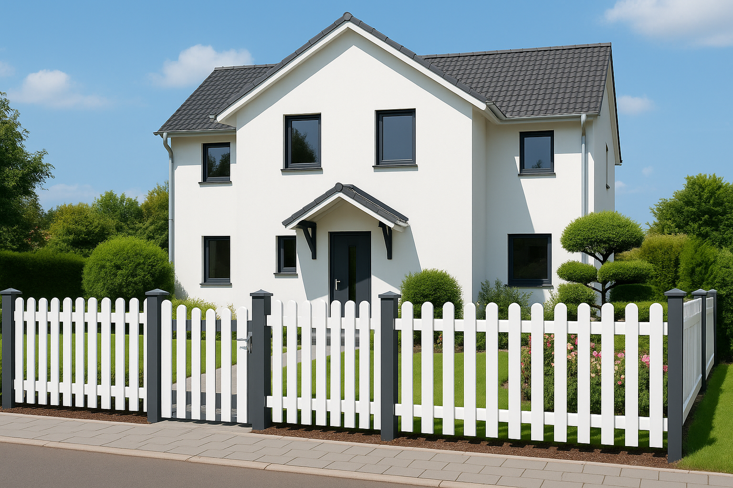 Weiße PVC-Zäune mit leichtem Bogenabschluss schaffen ein freundliches, einladendes Gesamtbild und passen ideal zu hellen Fassaden oder Landhausstilen.