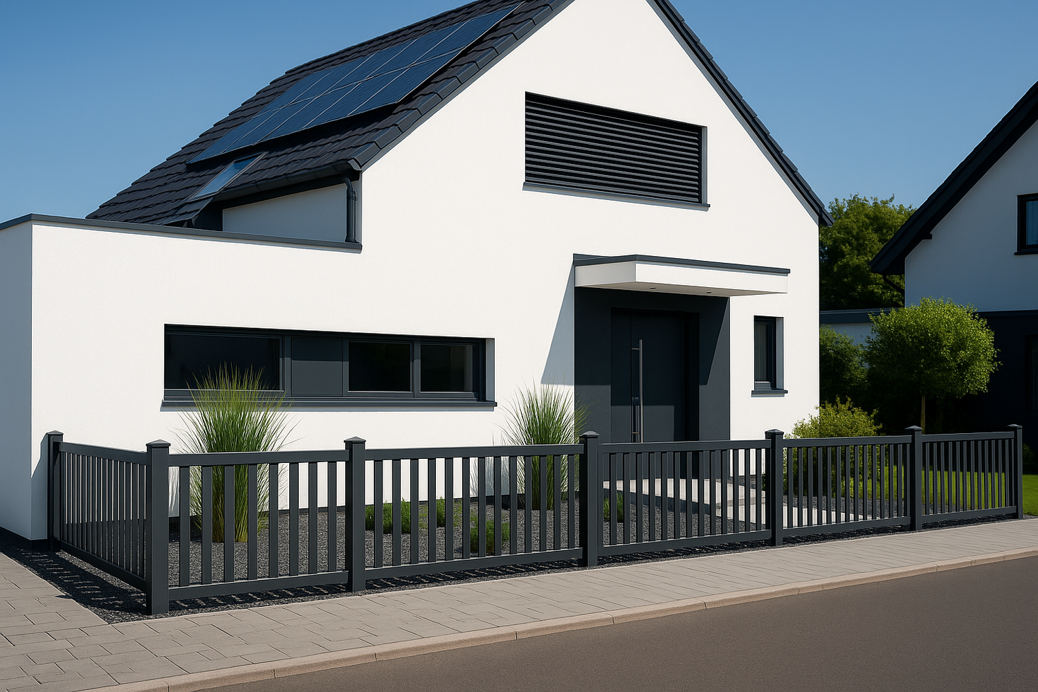 Ein Vorgartenzaun aus Aluminium mit klaren Linien verleiht deinem Hauseingang eine moderne und wertige Note. Passend dazu sorgen anthrazitfarbene Pfosten für elegante Kontraste.