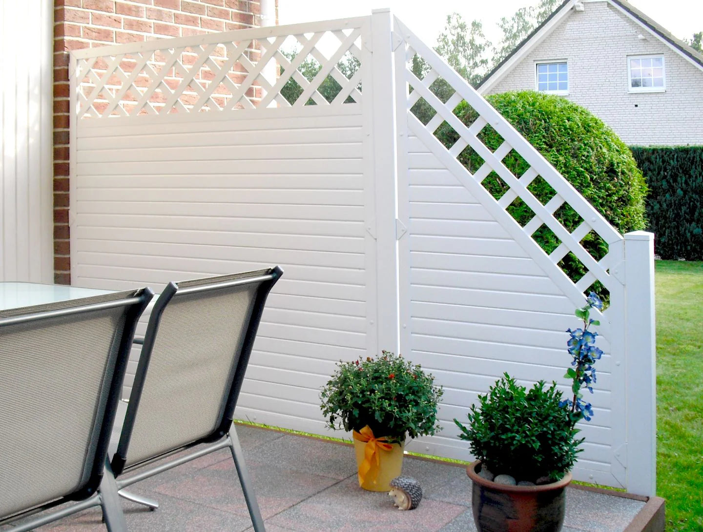 Für mehr Offenheit und gestalterischen Spielraum stehen Kombielemente mit Rankgitter zur Verfügung. Der untere Bereich bleibt blickdicht, während das obere Gitter Leichtigkeit schafft und sich hervorragend für Pflanzen oder dekorative Akzente eignet. Besonders in Eingangsbereichen, auf Terrassen oder an Sitzplätzen entsteht so ein aufgelockerter Gesamteindruck.