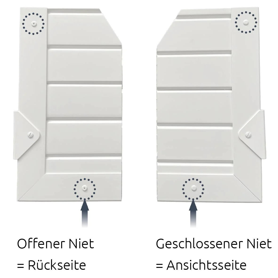 Das Foto zeigt die Vorder- und Rückseite eines Zaunelements im Detail. Die Sichtseite ist geschlossen und sauber vernietet, wodurch eine ruhige, gleichmäßige Optik entsteht. Auf der Rückseite ist die offene Nietverbindung sichtbar – ein technisches Konstruktionsmerkmal, das für zusätzliche Stabilität sorgt, ohne das Erscheinungsbild auf der Vorderseite zu beeinträchtigen.